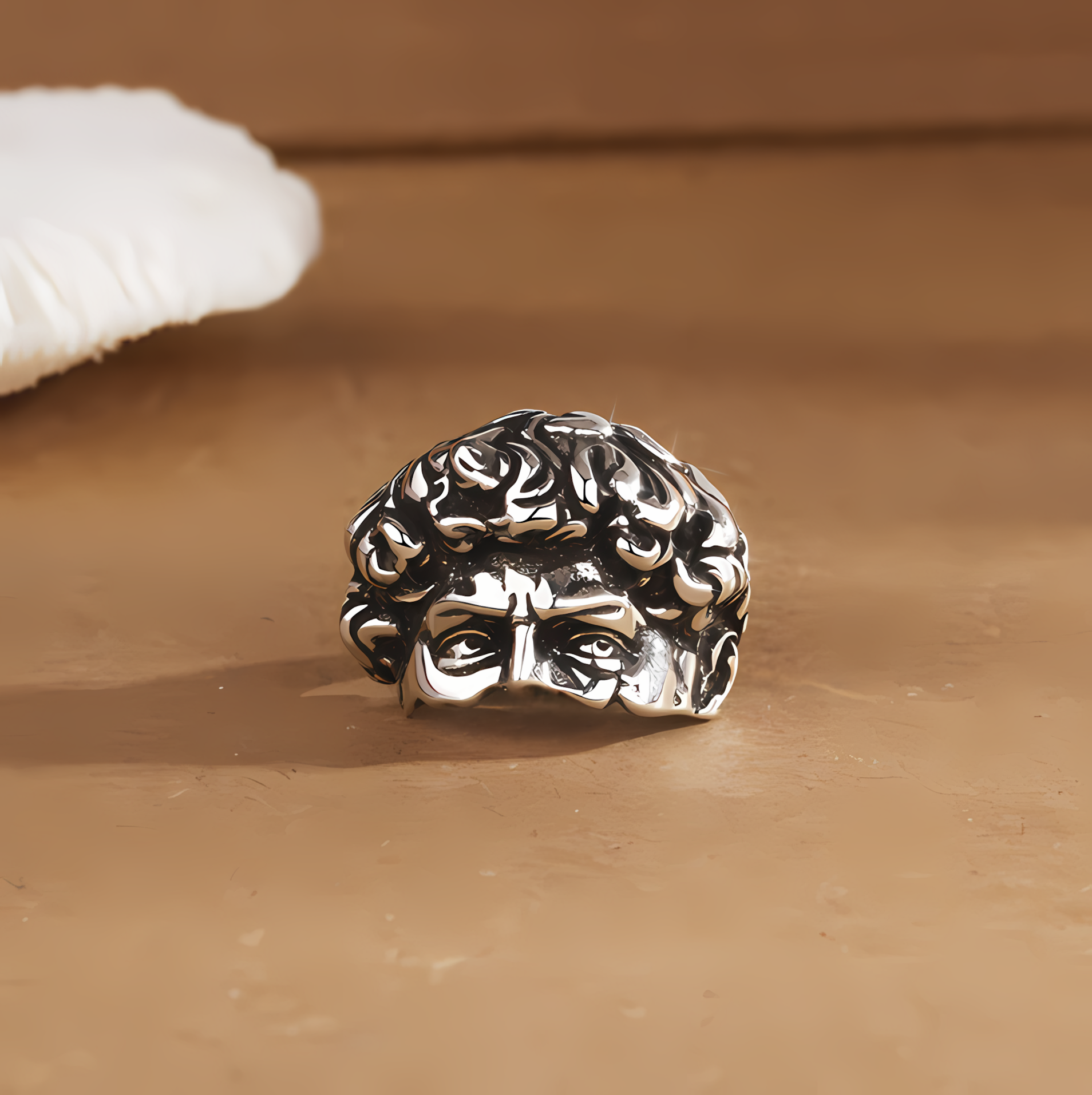 Handcrafted from oxidized Thai silver, the ring’s intricate detailing highlights the raw beauty and emotion of David’s eyes and hair, lending a modern edge to classical elegance. Each contour tells a story of rebellion, artistry, and timeless masculinity.