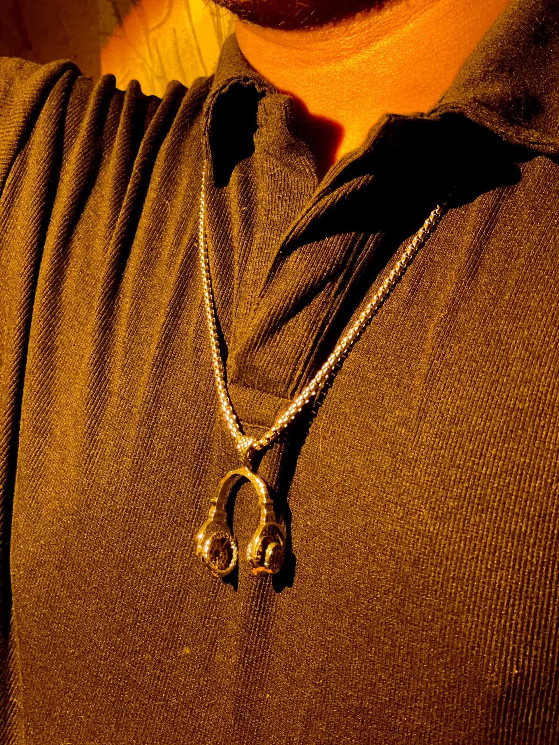 Crafted for audiophiles, DJs, and music lovers, The Aureate Audio Pendant is a bold tribute to the power of sound. Featuring intricately detailed earcups and textured arcs, this pendant mimics a vintage-style over-ear headset, suspended from a sleek box chain that complements its urban aesthetic.